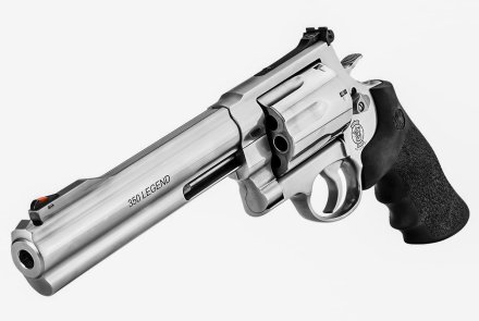 The first Smith & Wesson production revolver chambered in the straight-walled .350 Legend caliber, and one of the few models to be built on the huge X-Frame originally designed for the “dinosaur hunting“ .500 S&W Magnum cartridge: this is the new Model 350, an X-Frame size, seven-shot double-action/single action revolver with an all stainless-steel construction. With a 7.5” ported barrel with red ramp front sight and adjustable rear sight system, the Model 350 features a cylinder that utilizes moon clips for loading and unloading.