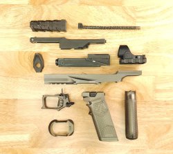 The Rideout Arsenal Dragon is a gun designed to be fully modular: the frame is made from 7075-T651 aerospace grade aluminum; on the rear of the frame is located the platform for the mounting of red dot sights, which then remains stationary when the gun is fired. This mounting platform, called N-ROC (Non-Reciprocating Optics Carrier) is patent-pending and is a core feature of the Dragon pistol. The N-ROC accepts RMR-footprint sights. During operation the N-ROC stays firmly fixed to the chassis, via its auto locking detent, keeping the sight picture stable. However, the shooter can still use the optic as a grip point to charge the bolt. The N-ROC system automatically locks to the chassis during firing, preventing any movement of the optic. No special hand position or button presses are required to use the N-ROC for cocking. This allows users to put the Dragon pistol into service without re-training from pistols equipped with slide-mounted optics.