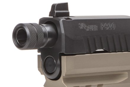 But aesthetics aside, it is also equipped with the SIG Custom Works optic-ready Nitron slide. The AXG grip module with extended magwell is FDE anodized. The 4.6”/177 mm barrel is 1/2x28 threaded for the mounting of suppressors – the reason why the pistol has been fitted with suppressor-height XRAY3 night sights for a taller and unobstructed sight picture.