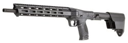 Thanks to an easy-to-use side folding mechanism, the 9mm M&P FPC has a 16.25”/413 mm long barrel but folds from 30.4" to 16 3/8" (772 mm to 416 mm) – quite compact for carry, cleaning, and storage. The charging slide/handle also doubles as retainer when folded. System is a simple and reliable blowback.