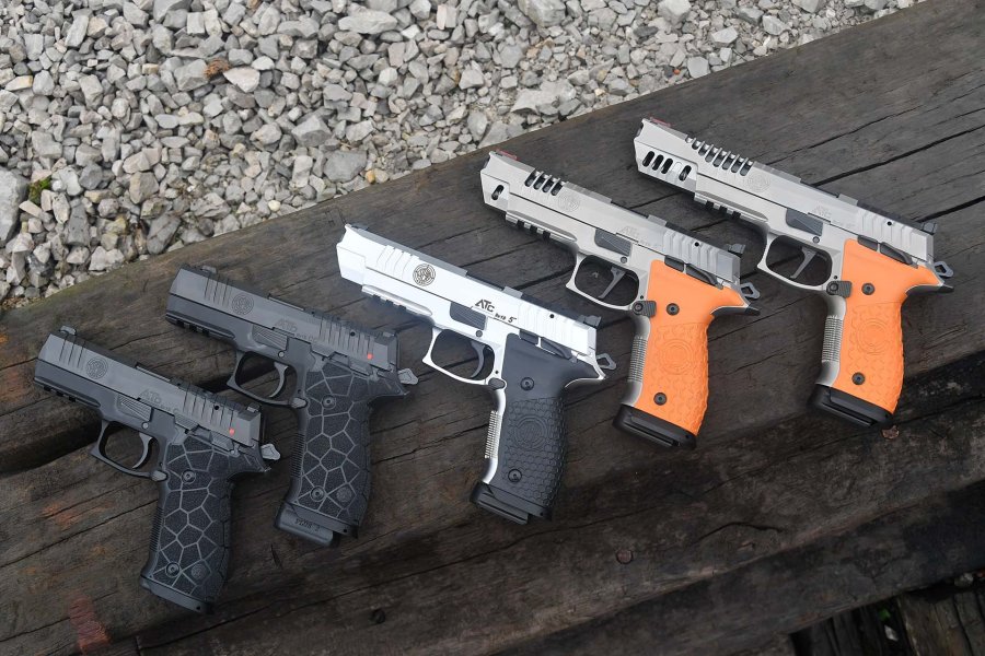 Sport models include the ATc Base 5”, in the white with black grips – very striking and elegant – and the duo ATc “Rock”, identical raceguns available in 5” and 6” barrel versions, tuned SAO triggers with hi-viz orange grips and grey PVD finish.