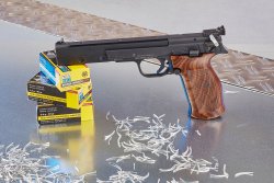 Features: micrometer rear sight and rotatable front sight, 45-degree safety, walnut grips, match trigger, 11 mm rail, 2 magazines, case. | |