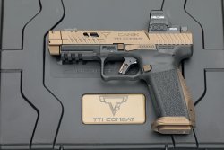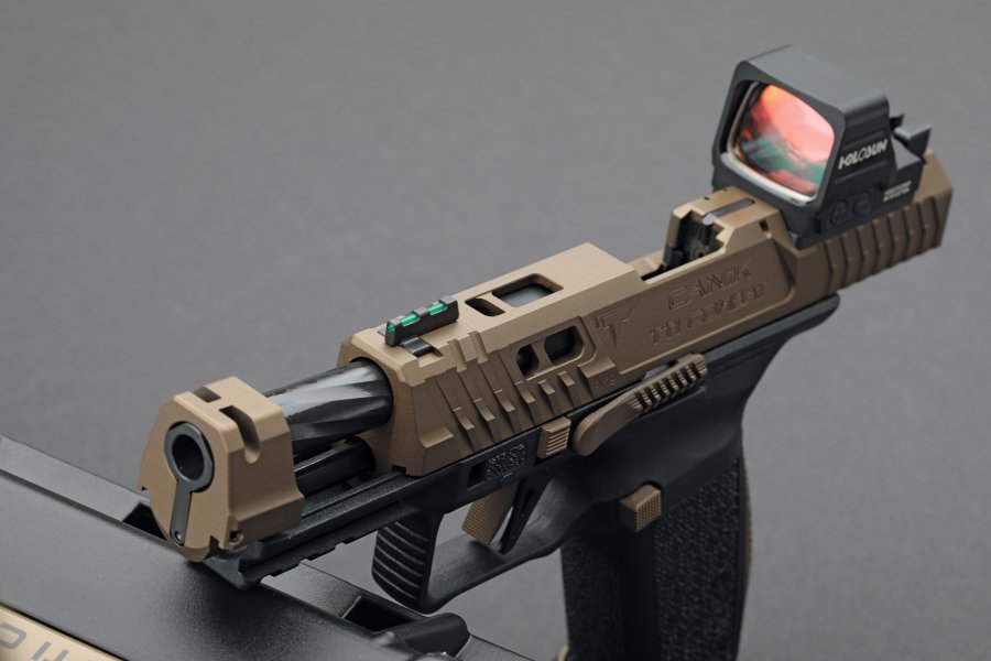 The attractive pistol is based on the technology of the Canik TP-9/Mete models, which have been tried and tested hundreds of thousands of times (click here for the Canik Mete SFX/SFT test on all4shooters.com). These series consist of polymer-framed striker-fired pistols with fully pre-cocked single-action trigger and consistent trigger characteristics from the first to the last shot. Incidentally, the Turkish manufacturer does not only know how to build "plastic pistols", as the affordable all-steel Rival-S pistol has clearly demonstrated (see our Rival-S test report). This model and the new TTI Combat are Canik's current flagships. Even at first glance, the TTI Combat catches the eye with its "Burnt Bronze" Cerakote finish, which is applied to the slide, the controls, the magwell, the magazine base pads and the grip backstrap of the otherwise black polymer frame. Another eye-catching feature is the compact compensator with a single expansion chamber, which emphasises the coolness factor. In the USA, compensators are all the rage even for sub-compact pistols for everyday concealed carry. A trend that is highly debatable.