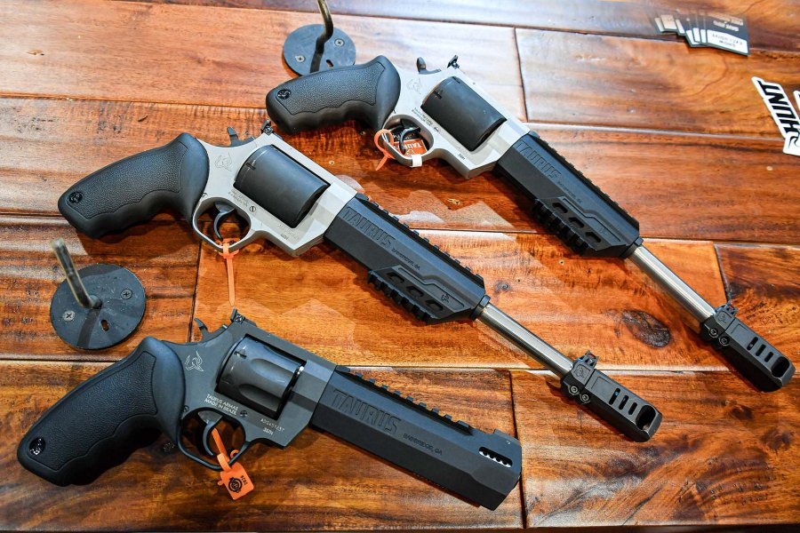 As always, the Taurus booth reserved strong emotions for revolver enthusiasts. The glimpse of the models in the Raging Hunter series was truly spectacular, although none of them are really new. The first revolver pictured above is the Raging Hunter chambered in .350 Legend, a straight-wall cartridge launched on the market in 2019 and designed primarily for lever action rifle hunting. A standard cartridge in .350 Legend propels a 145-grain bullet has a muzzle velocity of 716 m/s, with an energy comparable to a .30-30 round but with significantly less recoil. The Taurus Raging Hunter in .350 Legend is offered in two sizes: with either a 10.5- or 14-inch barrel (266 and 355 mm, respectively), with an eye-catching proprietary gas-expansion chamber. The cylinder has a capacity of six cartridges, while the shroud that wraps around the initial section of the barrel has an upper Picatinny rail for optic mounting and a lower rail for a bipod. The two-tone finish makes this behemoth revolver, which in the shortest version (so to speak) has an empty weight of 2,250 grams, even more distinctive. In the middle of the photo you can see the version in .460 Magnum, again with a 10.5-inch barrel. Finally, at the bottom we can see the new Taurus Raging Hunter in .357 Magnum with a 5 and 1/8 inch (or 130 mm) barrel and seven-round cylinder. The barrel is ported and sleeved: the light alloy shroud supports the Picatinny optic rail. Price in the USA is approximately $1,100.