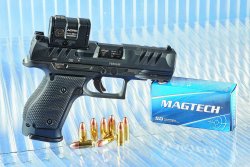 The match machine: the Walther PDP SF Match in action. In contrast to the compact version, the PDP SF Match was clamped in the shooting rest. Apart from the fact that the majority of groupings at 25 meters are safely within the ISSF ten of 50 mm in diameter, the only striking feature is the great homogeneity of the groups. Thanks to the excellent trigger characteristics and red dot aid, many shots into the ten could also be achieved manually with the "long" model. However, for the match variant, the focus is less on static and more on dynamic shooting. In addition to IPSC, the PDP SF Match should also score points in multi-range disciplines. There were no malfunctions or other anomalies with any of the test guns. However, with a manufacturer that has well over 100 years of experience in making semi-auto pistols, this is hardly surprising. And at this point I would also like to praise the (Italian) magazines. Some force is required to top off the last cartridges, but overall the magazines are very smooth to load.