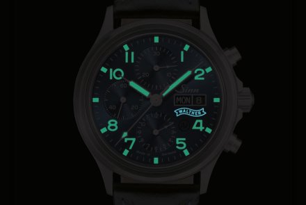 The Sinn 358 Walther watch comes as an automatic chronograph. It has an hour and minute display, as well as a small second hand. There is also a date, day of the week and the chronograph function. The case is made of satin-finished stainless steel, while the dial is a deep dark blue colour with a galvanic sunburst finish. In addition to the Sinn logo, it also features the iconic Walther ribbon. The indices, hands and numerals are ivory-coloured, creating an elegant contrast. The elements glow in the dark. The watch utilises the Ar-Dehumidifying Technology that enhances functional reliability and freedom from fogging. The glass is made of sapphire crystal. Pressure resistance is guaranteed up to a pressure of 10 bar, and the watch is also water-resistant. Through the transparent back of the watch, which is also made of sapphire crystal, the observer can recognise three beautiful details on the rotor: this not only shows the limited edition, but also the same edition number as the pistol. It also features the Walther ribbon.