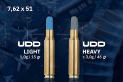 The UDD does not follow this technical approach. Here, the bullet is made from a modern polymer and is classically inserted into a brass cartridge case. What they do have in common is the extremely low weight of the bullet and the high muzzle velocity. The UDD cartridge is currently available with two different bullets. The "Light" version has a bullet weight of around one gram, while the "Heavy" version weighs three grams. The UDD Light is already listed in the RWS military and LE catalog. The muzzle velocity is up to 1,300 meters per second. This results in an effective range of up to 120 meters for the UDD Light, with a danger zone of up to 500 meters. With the UDD-Heavy , the effective range increases to up to 400 meters, combined with a danger zone of up to 1,300 meters.