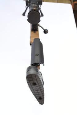 The extended forend is peppered with AI keyslots to add accessories and desired weights to finely control balance point. There is a full-length ARCA rail underneath for secure attachment to tripods or bipods with a solid barricade stop just in front of the magazine well allowing you to force the gun hard into solid supporting structures. This stock’s butt is non-folding configuration, but a folder is a likely option that I would probably choose as it speeds quite simply speeds up bolt removal and use of a cleaning rod which here, requires the cheekpiece to be removed for linear access to the bore.