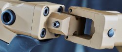 The joint is absolutely free of axial and radial play. Folding the stock on the right side of the rifle shortens the length by 208 millimetres. To unlock, simply pull the stock with a little force.