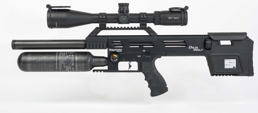 Other notable features of this airgun include an electronic release trigger that allows the user to adjust length of stage, pull weight and blade position according to the user's wishes. The Delta Wolf is fed from rotary magazines with a capacity of 13 (4.5mm), 11 (5.5mm), 10 (6.35mm) and 8 (7.62mm) rounds respectively. Magazines can be inserted from either the right or left side and can be installed and used in concert to double the shot count. To meet regulation requirements, a single-shot magazine is also available and supplied.