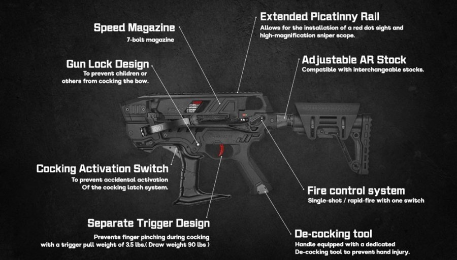 During loading, the upper assembly slides forward allowing the shooter to keep the target in sight at all times. The newly designed, removable magazine allows loading in seconds and holds seven proprietary bolts, 6.5 inches long, with carbon shaft and weighing 142 grains. (The magazine is equipped with an anti-dry fire system, safeguarding the crossbow from damage.) Draw weight is 90 lbs, more than enough for a powerful and accurate shot with an exit velocity of 235/250 fps (about 70/75 m/sec); additional limbsets in other poundages (30lbs, 60lbs, 120lbs) can be purchased separately. Cocking the bow and positioning the dart on the rail is done in a single movement, using the front pistol grip. The pistol grip provides a very solid purchase and swing, while the red dot sight with aluminium housing allows for instinctive aiming. The extended Picatinny rail allows other mechanical or electronic sights to be mounted without any difficulty.