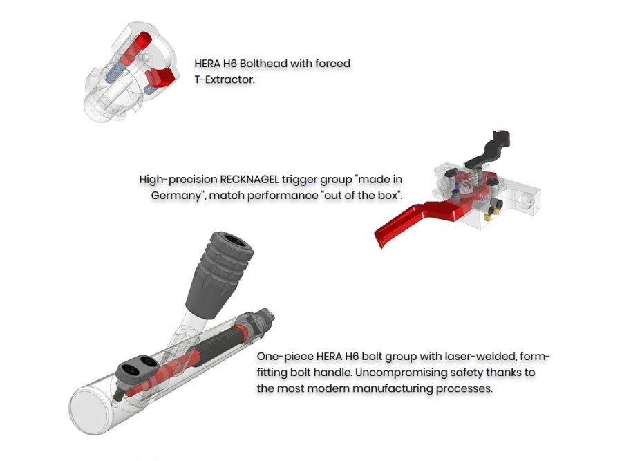 Instead of aluminum as initially planned, the Hera designers opted for steel after all, with a one-piece receiver and a laser-welded bolt handle. The H6 bolt has a positively controlled T extractor, which enables both safe extraction and maximum contact surfaces for the locking lugs. Despite the steel construction, the additional weight compared to aluminum has been limited to around 200 grams. Hera continues in the H6 information on the website: "The optimized H6 trigger has a safety that can be operated with the trigger finger and is probably one of the best standard triggers that can be installed, both technically and in terms of quality."