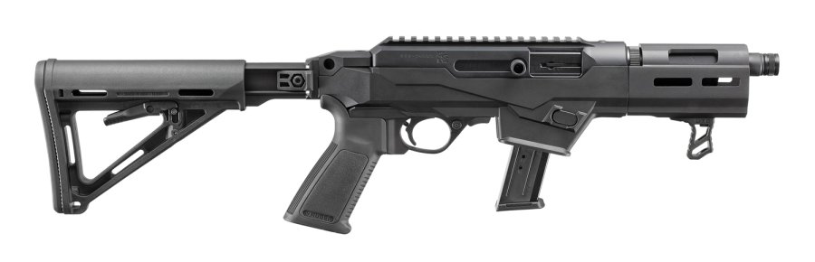 Let's start with the PC Carbine. Sporting a very “tacticool” look, the 9mm PC Carbine SBR variant comes with a black synthetic chassis, a six-position telescoping Magpul stock, and a CNC-milled aluminum free-float handguard with attachment slots on all four sides and a removable M-LOK hand stop. The short6.5”/165 mm cold hammer-forged barrel is threaded 1/2"-28 (a thread protector is included). Magazine wells are interchangeable for use of common Ruger and Glock magazines: the model ships with the SR-Series/Security-9 pistol magazine well installed, along with one 17-round SR-Series or Security-9 9mm magazine. An additional magazine well that accepts most double-stack Glock-pattern magazines is also included. Magazine release and charging handle are reversible. Price in the US is $1099.