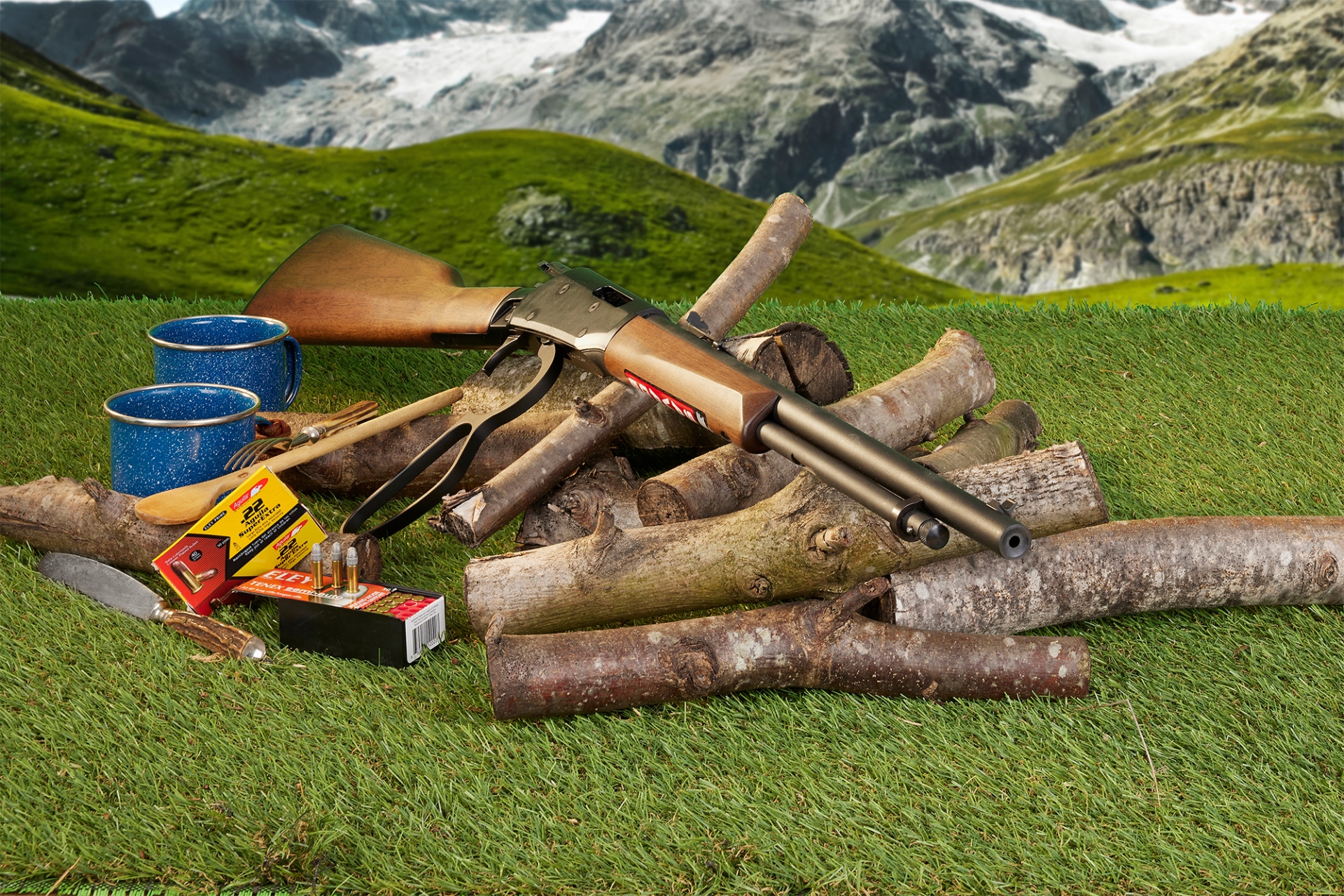 Equipment: | Lever-action rifle with tubular magazine. Takedown. Walnut stock, oil finish and polymer butt plate. Powder-coated aluminum receiver. Barrel, magazine tube, controls made of steel and blued. Height-adjustable buckhorn rear sight, drift-adjustable bead front sight. Cardboard box with instruction booklet (English), safety flag and padlock. |