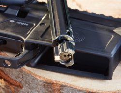 Although the stock of the Cross, which can be folded to the right of the receiver, looks quite delicate at first glance, it surprises with its stability and firmness. When folded out, it sits bombproof, does not wobble and locks with only a little play on the hinge axis. However, releasing the lock is a bit tricky. While the thumb presses the lock button into the hinge, the other fingers have to lift up the shoulder rest slightly to separate the hook-like latch on the opposite side. Only then the part can be folded, shortening the overall length of the test gun to a handy pack size of 70 centimeters. The skeletonization and the adjustment parts of the stock do not get in the way of the bolt handle in any setting. The bolt handle fits perfectly through the largest opening in the skeletonized stock. When folded, the stock also prevents unintentional opening of the chamber. The designers have thought of almost everything at this point: what we miss, however, is an option that allows the folded stock to be locked down reasonably. Unfortunately, the button on the hinge side is not enough to lock the folded stock without play, and the whole thing flaps around rather loosely. However, the functionality of the stock makes up for this shortcoming in a big way. This leaves little to be desired in terms of individual adjustment to the shooter. The support for the buttpad is a good 2.5 mm thick and 46 mm wide steel plate with three guide grooves, which is also guided through the rear end of the skeleton frame. The two outer grooves each have ten counterbores for a locking bolt. This allows the length of the stock to be adjusted by a total of 50 mm in 5 mm increments after loosening a screw. This also allows the length of pull of the Cross to be varied between 325 and 375 mm, measured in each case from the trigger to the end of the butt plate. The screw leads through the middle groove in the plate, which can be tightened extremely firmly with its wing head and presses on a clamping piece that extends over the entire rail width. Here, nothing really wobbles anymore. The height-adjustable rubber buttpad sits on the angled end of the plate. After loosening two Torx screws, this can also be moved to the side or tilted a few degrees. The height of the pad can be adjusted from the center position by three clicks upwards on a plastic rail and thus by a total of 60 mm. A spring-loaded pushbutton takes care of the locking here. Those who are familiar with the current pistols of the 320/365 series from SIG Sauer will note with a smile that this pushbutton with its three-sided contour and ribbing apparently corresponds to the magazine release of these pistols. And why not, in both cases the part basically fulfills the same mechanical function. The most pleasing feature of the stock, however, was the comb, which is continuously adjustable in height by about 2.5 cm. It rests on two longitudinally slotted and spring-loaded shafts. After releasing an additionally secured clamp lever by pushing a button, the shafts automatically move out of the frame of the stock to the upper stop. Now you can bring the rifle into the aiming position and by light pressure of the cheek on the stock comb move the latter comfortably in the individually optimal position to fix it there by swinging the clamp lever up absolutely wobble-free. Overall, the stock of the Cross is one of the best thought out, which we have encountered so far – Chapeau!
