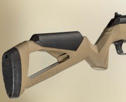 That's not all: by separating the trigger/bolt assembly from the rest of the rifle, the Wildcat can be transported safely and any repairs are also simplified. The bolt release button, on the other hand, is located in front of the trigger guard and allows the action to be locked open for safety when storing or transporting. The magazine can be separated from the action in two ways: by pulling back the release located in front of the magwell or by pressing both of the two red-coloured buttons visible on the sides of the receiver. The manual safety is instead engaged by pressing the button located behind the trigger guard, easily reversible to the delight of left-handed shooters. The design of the skeletonized polymer stock is fully ambidextrous too, with a pistol grip carefully designed to offer support and grip for both right and left-handed shooters. The comb riser is black and like the thick recoil pad contrasts nicely with the basic Flat Dark Earth color of the polymer stock. The stock surface is relatively rough, while the grip areas are smoother and grooved to provide a firmer and more immediate purchase. The stock features Front and rear sling eyelets.