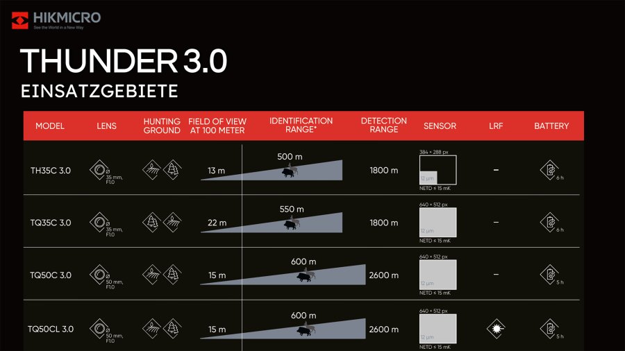 Une autre différence est bien sûr l'objectif. Dans cette série également, HIKMICRO propose des focales adaptées aux besoins. Les modèles TH35C 3.0 et TQ35C 3.0 sont équipés d'un objectif de 35 mm, tandis que le TQ50C 3.0 et le modèle haut de gamme TQ50CL 3.0 sont équipés d'un objectif de 50 mm. Comme d'habitude, le choix se fait en fonction de l'éventail des applications et des besoins en matière de grossissement et de champ de vision qui en découlent. Ainsi, le Hikmicro TH35C 3.0 apporte - en raison du capteur plus petit - un champ de vision de 13 mètres à 100 mètres, tandis que les deux modèles de 50 atteignent 15 mètres. C'est bien entendu la combinaison d'un grand capteur et d'un objectif de 35 qui offre le plus grand champ de vision : le TQ35C 3.0 offre au chasseur / à la chasseuse un champ de vision de 22 mètres à 100 mètres. C'est remarquable.