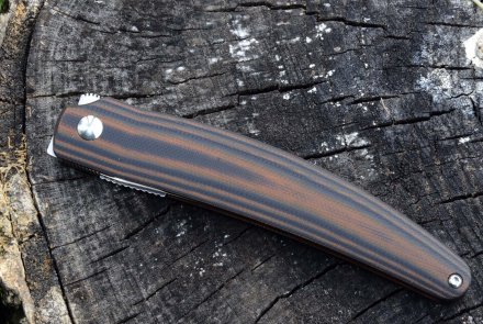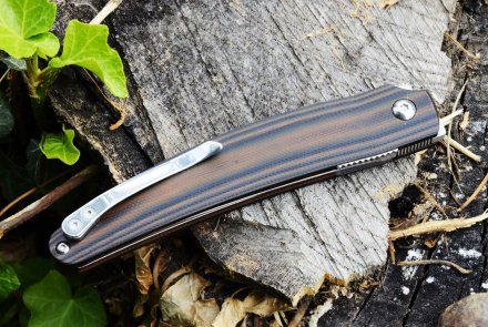 Le manche du CRKT Ancestor reprend la progression sinueuse de la lame et se compose d'une paire de plaques multicouches en G10 rappelant les teintes et le grain d'un bois fin, montées sur deux plaques d'acier inoxydable avec de grandes fraises foudroyantes. La surface du manche n'est pas quadrillée, mais la rugosité naturelle du matériau lui confère une bonne prise en main. Le clip est en acier inoxydable, fixé à l'aide d'une paire de vis Torx sur le côté droit du manche et permet de porter l'Ancestor "tip up". Le clip peut seulement être enlevé, mais pas échangé d'un côté du manche à l'autre. Sur la balance, le CRKT Ancestor pèse 80 grammes, ce qui n'est pas mal pour un linerlock avec une lame de plus de 9 centimètres de long ; il plaira certainement à ceux qui recherchent un linerlock léger et discret pour le transport, mais avec une bonne capacité de coupe et une ligne originale et rationnelle. Le prix est également assez léger: environ 80 euros, ce qui pour un produit de ce type doit être considéré comme très correct. La fabrication en Chine n'affecte en rien la qualité du CRKT Ancestor.