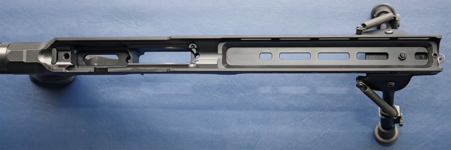 La crosse avant de 37,5 mm de large est dotée d'interfaces M-LOK sur les côtés et sur la face inférieure. Devant le logement du chargeur se trouve une butée, qui n'est utile pour une utilisation PRS. Sur la face inférieure du protège-main en alliage léger, on découvre un œillet pour la bretelle qui permet le montage simple et rapide d'un bipied. Le pontet imposant offre suffisamment de place pour le doigt, même en hiver avec des gants. Grâce à sa partie frontale droite, la crosse convient très bien au tir posé à partir du bipied ou de l'appui. La crosse fixe est idéale pour le tir couché, et l'ouverture dans la partie inférieure pour la main de soutien permet de tirer en position couchée ou à partir d'un sac de sable. La partie arrière en forme de crochet permet de rentrer la CZ 457 MDT dans l'épaule de manière stable.