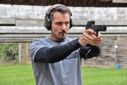 Ensuite, la prise complète est réalisée à l'aide de la main de soutien. Pour cela, la paume de la main est amenée autant que possible dans la zone encore libre de la poignée. Ici aussi, il faut veiller à ce que la main soit placée le plus haut possible sur l'arme. Le levier d'arrêt de la glissière peut servir de guide, la paume de la main doit être placée sur l'arme à peu près à la hauteur de son bord inférieur. Le pouce doit alors être parallèle à la culasse et pointé vers l'avant. Les autres doigts entourent la main de tir. On peut imaginer un angle de 45 degrés entre la poignée et la glissière, les doigts étant dirigés vers le bas. La pression sur la poignée ne doit pas être appliquée en serrant les doigts : La pression doit plutôt provenir des avant-bras via vos poignets fermés et verrouillés. Imaginez que vous voulez écraser une noix entre les paumes de vos mains.