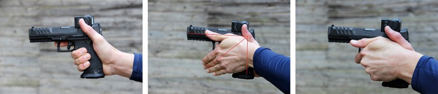 La prise en main de l'arme est l'un des éléments prépondérant lors du tir à l'arme de poing, mais c'est aussi l'un des plus mal exécuté. La prise en main s'effectue au niveau du pli du pouce de la main qui tire. Celui-ci doit être placé le plus haut possible sur le dos de la crosse de l'arme afin d'être le plus proche possible de l'axe du canon. Ceci est très important car la dissipation d'énergie, et donc le recul, se fait au niveau du canon. Plus on se rapproche de cette ligne, plus on peut contrôler le recul, car le basculement est minimisé. Avec l'auriculaire, l'annulaire et le majeur, on exerce ensuite une contre-pression à l'avant de la poignée. Il est important de ne pas simplement comprimer la poignée, mais plutôt de la serrer entre les doigts, la paume de la main et le creux du pouce en exerçant une pression à partir du petit doigt. Enfin, il reste le pouce de la main de tir. Celui-ci fait d'abord de la place ! Une erreur fréquente consiste à laisser le pouce sur le côté de la poignée. Cela pose un problème car il n'y a pas de place pour que la deuxième main puisse soutenir l'arme. C'est pourquoi le pouce doit d'abord être retiré de l'arme, légèrement sur le côté et vers le haut, et laisser de la place. Cela a pour effet secondaire d'exercer une pression supplémentaire vers le haut et d'augmenter encore la hauteur de la poignée.