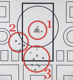 2. l'image de tir typique en cas d'erreur de détente par un tireur droitier - la tension musculaire due à la courbure du doigt de détente fait que les tirs se déplacent vers le bas et la gauche.