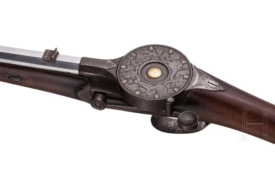 En même temps, le canon s'est rétracté de quelques millimètres, bloquant le barillet, dont la face avant était élargie en conséquence et avait la double fonction de bloquer le barillet et d'empêcher le gaz de s'échapper. Lorsque l'on appuie sur la détente, le percuteur est poussé vers le haut et frappe la partie saillante de l'amorce à travers une cavité dans le tambour, ce qui déclenche le tir. Les cartouches pour la carabine Genhart ne pouvaient pas être achetées, mais un kit simple était fourni avec le fusil, ce qui permettait de les fabriquer soi-même à la maison avec des balles de plomb, de la poudre et une feuille d'étain, et bien sûr les amorces spéciales. Le système de Genhart a également été appliqué à une série de pistolets, mais n'a pas eu le succès escompté, bien que l'arme ait été très bien conçue et que certaines précautions aient été prises pour assurer la sécurité du tireur. La difficulté de trouver des gâchettes a probablement aussi joué un rôle et aujourd'hui, le nom de cet inventeur génial est resté dans les mémoires grâce aux collectionneurs qui, comme on peut facilement le prédire, se disputeront le fusil mis en vente chez Hermann Historica. La carabine est en bon état, avec un canon rayé de section octogonale et un couvre-tambour gravé avec des marques et des numéros sur les cartouchières, restaurées en or. C'est un beau témoignage de la transition du chargement par la bouche au chargement par la culasse, qui trouve dans cette arme l'une de ses expressions les plus géniales. Pour rappel, le numéro de lot est le 11196 et le prix de départ est de 9000 euros.