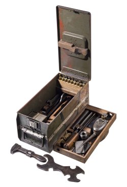 Nous terminons avec le lot 12900 qui, s'il n'est pas une arme à feu, n'en est pas moins attractif pour le collectionneur : il s'agit d'une boîte à outils originale pour la mitrailleuse MG 08/15, qui était une arme de l'armée allemande pendant la Première Guerre mondiale. La boîte en fer peinte dans des couleurs de camouflage (rayée et avec des traces de rouille), marquée en blanc 'E' et '08/15', contient sur deux niveaux des outils spéciaux, dont des pinces, une lime, une clé MG 08/15 (marquée 'Becker, Remscheid'), une clé à molette ('M.G.K. 2'), un tournevis, un bâton de nettoyage, une clé à goupilles, des cartouches de tampons et deux petites boîtes en tôle contenant des pièces de rechange et autres petites pièces. Partiellement chambrée, réparée, avec traces d'utilisation et d'ancienneté. Dimensions de la boîte 39 x 18 x 17 cm. Une ancienne étiquette de collection est jointe. La mitrailleuse MG 08/15, basée sur le modèle Maxim de 1884, a également été utilisée occasionnellement pendant la Seconde Guerre mondiale (front de l'Est) et le contenu des boîtes a été modifié pendant son utilisation. Le prix de départ de ce lot est de 1500 euros.