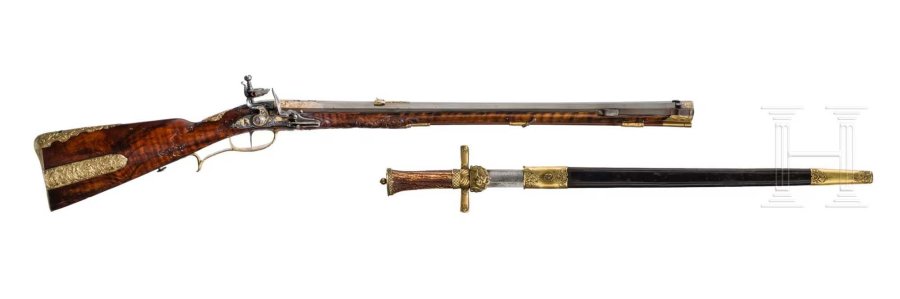 Pendant longtemps, la chasse a été un privilège de la noblesse et un événement social très important. C'est pourquoi chaque châtelain ou seigneur disposait d'une armurerie dans laquelle ses invités pouvaient emprunter un fusil pour participer à la chasse. C'était certainement le cas des princes Schwarzenberg, l'une des familles les plus importantes de la noblesse autrichienne, qui a donné naissance à un grand nombre d'hommes politiques influents à la cour de Vienne. Ce magnifique fusil à silex (lot 1998) a été fabriqué vers 1740 par l'armurier Leopold Becher et porte non seulement les armoiries des princes de Schwarzenberg, mais il est également accompagné d'une belle dague avec poignée en bois de cerf, protection en laiton et lame à double tranchant. La dague peut être montée sur la carabine grâce à un système de bouton-pression et est accompagnée de son fourreau en cuir noir d'origine avec des garnitures en laiton doré et gravé. Le canon rayé octogonal de calibre 15 millimètres porte un cran de mire rabattable et le guidon en queue d'aronde. Les batteries, le marteau et le début du canon sont décorés de gravures et en retrait en or. La crosse d'origine est fabriquée en noyer et ne présente que quelques petites traces de vers à bois. L'armurier Leopold Becher a travaillé à Karlovy Vary (Bohême) de 1725 à 1750 environ. Nous ne savons pas si le riche propriétaire a déjà prêté ce chef-d'œuvre à l'un de ses invités, mais il est probable qu'il change définitivement de propriétaire lors de la vente aux enchères numéro 100. Le prix de départ est de 12000 euros.