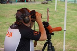De plus, les distances de visée ont également été abordées par les Range Officers (RO) lors du briefing obligatoire avant chaque passage à un stage, tout comme l'ordre dans lequel les plaques d'acier devaient être tirées. En plus des RO, l'exploitant du stand de tir Le Arcate et Match Director Valerio Junio Lunatici avait désigné, avec le Range Master Gianni Guidi, un Spotter à chaque stage , qui confirmait chaque impact par un "Impact" bruyant. Pour les cibles très éloignées, le tireur recevait ainsi une annonce acoustique de l'impact avant même que le "pling" typique de l'impact sur l'acier ne se fasse entendre sur la scène. Les cibles étaient de tailles différentes selon la distance et le degré de difficulté de l'exercice, allant de petites cibles de 5 x 5 cm, 8 x 8 ou 10 x 10 cm à des plaques d'acier de 35 x 35 ou 50 x 50 cm, en passant par des cibles moyennes de 15 x 15 ou 25 x 25 cm. Pour les étapes les plus difficiles, il fallait d'abord toucher une cible proche, puis une autre très éloignée. Ainsi, dans la Stage 6, il fallait d'abord toucher une plaque d'acier de 25 x 25 cm (cible A) à 210 m, puis des plaques de 50 x 50 cm à 1002 m (cible B1), 1012 m (cible B2), 1010 m (cible B3) et 1000 m (cible B4), qui étaient positionnées nettement plus à gauche des tireurs dans une pente raide. En plus du défi que représentait le fait qu'après avoir touché la cible B1, il fallait à nouveau toucher la cible A avant de pouvoir tirer sur la cible B2, le fait que les tireurs ne pouvaient travailler qu'avec le réticule de la lunette de visée - toucher et donc déplacer les tourelles était tabou - cela venait compliquer la situation. En revanche, il s'agissait de l'un des deux stages où il était permis de "rattraper" les munitions et où il était possible d'utiliser plus de huit cartouches en 90 secondes que le maximum autorisé par ailleurs.