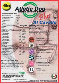 Atletic Dog Plus al Cavallo, reperibile in sacchi da 15 kg. Con il suo 35% di proteina derivato da carne di cavallo, e il suo sempre elevato tasso di grassi di purissimo strutto rettificato di suino, è il prodotto per eccellenza di quei cani sottoposti a sessioni reiterate di sforzi intensi e prolungati, in climi e ambienti estremi! Pensiamo a cani da beccacce, impegnati in sessioni all’estero. Pensiamo a cani da montagna, nel clou della stagione. Altrettanto pensiamo a cani da cinghiale nel cuore d’invernate fredde, impegnati in sessioni ravvicinate di lavoro. Non solo, è un prodotto utilissimo anche per il recupero di cani operati e/o feriti e che abbiano perso molto sangue, grazie alla capacità di moltiplicare i globuli rossi creata dalla presenza di carne di cavallo.