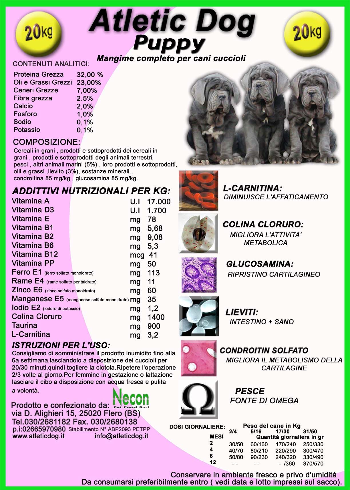 Atletic Dog Puppy, anche questo nel pratico e vantaggioso formato da 20 kg. È un prodotto studiato espressamente per cagne in gravidanza e allattamento, e cuccioli in età di accrescimento fino agli 8/10, mesi.