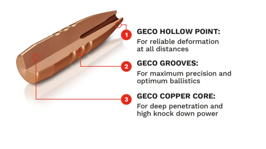 - Le scanalature del proiettile (GECO GROOVES) garantiscono la massima precisione e una balistica ottimale.