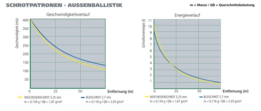 Sulla base dei dati di vendita internazionali, si può affermare che solo i pallini d'acciaio si sono affermati con ampio margine nella caccia agli uccelli acquatici. Per ottenere un effetto sufficiente con i pallini d'acciaio, si raccomanda come regola empirica che i pallini siano più grandi di 0,5 mm. Il problema fondamentale è che la copertura è notevolmente peggiore. Sebbene i pallini d'acciaio più grandi siano un po' più pesanti di quelli di piombo, la maggiore superficie significa che i pallini vengono rallentati più rapidamente nell'aria. Questo svantaggio fisico (minore carico della sezione trasversale) significa anche che i pallini penetrano molto meno anche a parità di energia d'impatto. Con entrambi gli svantaggi, rimangono meno pallini, che uccidono meno efficacemente. Nonostante ciò, i pallini d'acciaio sono utilizzati con successo per la caccia agli uccelli acquatici in Nord America. Tuttavia, i molti anni di pratica dimostrano che sono necessari pallini più grossi di 0,75 - 1 mm per avere una portata e un effetto paragonabili (carico trasversale simile). A differenza di quanto avviene per le carabine, che possono sparare senza difficoltà le palle senza piombo, per sparare pallini di acciaio sono necessarie delle canne testate specificamente, come quelle dei fucili di più recente fabbricazione (CIP).