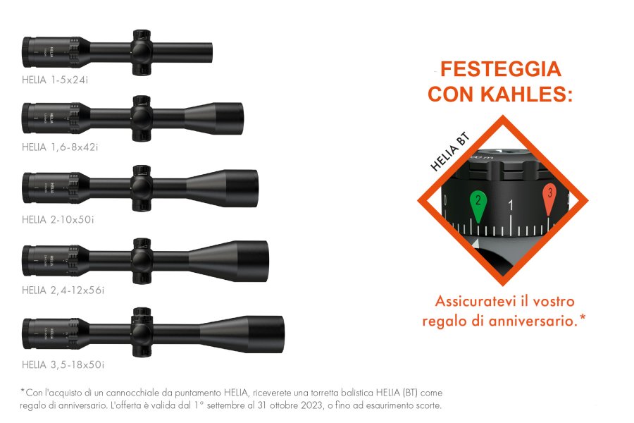 Nel periodo compreso tra il 1° settembre e il 31 ottobre 2023, ogni acquirente di un cannocchiale da puntamento Kahles Helia riceverà la Torretta Balistica (BT) come regalo di anniversario senza alcun costo aggiuntivo.