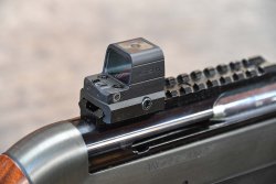 Comunque, mi sono procurato un adattatore RMSc per provare lo Osight S su una carabina Benelli Endurance, sfruttando la linea di mira bassissima che offre, sperando di mantenere la posizione di puntamento all’imbracciata… cosa che purtroppo non è successa poiché l’adattatore Picatinny introduce 4mm di spessore che aggiunti ai 15mm dell’altezza del punto rosso al centro della finestra, necessita di n piccolo innalzamento del poggiaguancia, che ho risolto con un ergo pad, come si vede dalle immagini a corredo di questo articolo. La linea di mira del mio Endurance viene su in modo estremamente istintivo, il reticolo luminoso dell’Osight S appare magicamente sul punto mirato con una celerità che stupisce. La visuale è ottima, il reticolo, sia il punto che le due variazioni con il circle/dot, è nitidissimo e i cristalli dell’ottica non introducono alcuna deformazione o aberrazione cromatica, al pari di mirini reflex ben più blasonati. Insomma, una ottima ottica che però soffre un po’ del prezzo, che con adattatore Picatinny sfiora i 350 Euro.