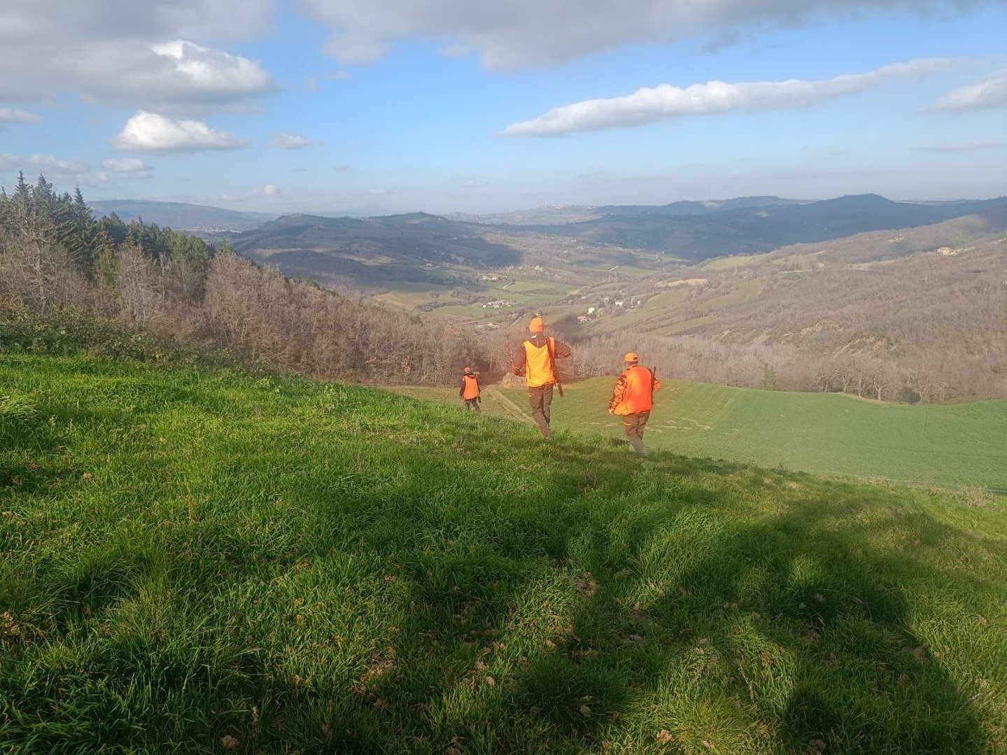 La zona interessata dalla battuta è piuttosto ampia e variegata nella sua orografia. Si alternano colline boscose a calanchi profondi dove i cinghiali cercano riparo soprattutto nelle zone maggiormente esposte al sole e fitte di vegetazione. Giunge nitido il suono del corno che dà inizio alla braccata e non tardano a farsi sentire anche le canizze che salgono e scendono a ritmo incalzante fra fossati e ripide salite. Sono diversi i branchi di cinghiali presenti in altrettante zone di rimessa e cercando di mantenere il massimo silenzio, si accendono tutti i sensi cercando di intercettare ogni possibile rumore o movimento proveniente dal bosco. L’emozione dei cinghiali in arrivo, aumentata indubbiamente dal punto rosso delle telecamere acceso gioca qualche scherzo alla mira che costerà ai “malcapitati “ qualche commento ironico al rientro nella casa di caccia. È la bellezza di questo antico rito che si ripete, immortale e coinvolgente nella sua genuinità. Alla fine della giornata dopo le emozioni si condividono le fatiche nel recupero dei cinghiali abbattuti. Fra i colori di un tramonto che ricalca il profilo dei sibillini si muovono lente le ombre di cani e uomini stanchi di cui si individuano i sorrisi e i commenti nel buio che avanza. Un’altra stagione volge al termine, lasciando questa sera non solo ricordi impressi nella mente, ma immagini in cui potersi ritrovare in attesa che il corno torni a suonare.