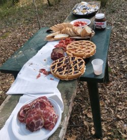 La caccia al colombaccio è molto impegnativa anche sotto il profilo fisico, non tanto nella mera azione di caccia, bensì nelle fasi di preparazione e altro, così che quando il passo si attenua e i morsi della fame si fanno sentire bussando alla porta dello stomaco, il cambusiere del gruppo si adopera per approntare su un tavolaccio posticcio ma che assomiglia alla tavola del Re, una robusta colazione composta da tutto quanto viene portato dai singoli componenti del gruppo per coronare una splendida cacciata andata alla grande, ma anche per lenire il dispiacere di una sonora imbiancata. Ovviamente anche il vinello è d’obbligo ma sempre con moderazione perché la strada per rientrare a casa è sempre lunga ed è meglio che i riflessi siano sempre al massimo.