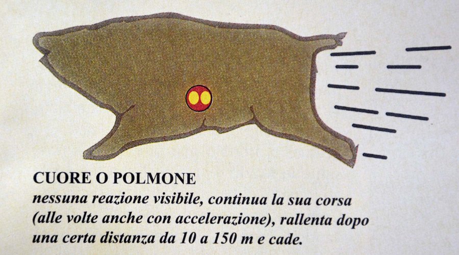 Se colpito al cuore il cinghiale percorrerà al massimo 400-500 metri prima di fermarsi. Se colpito al fegato percorrerà all’incirca dai 400 ai 700 metri, dai 1500 ai 2000 metri per una palla al collo, ai reni, ai polmoni o all’addome, tutti colpi mortali ma che non sono in grado di fermare il cinghiale sul posto.