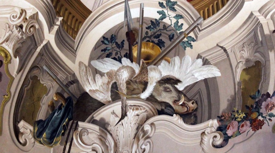A rimarcare ancora una volta la vocazione venatoria di Stupinigi e il fatto che a differenza di altre residenze Savoia, come la Venaria e Moncalieri, essa non fosse usata almeno inizialmente, come soggiorno se non per brevi periodi di tempo, due o tre giorni al massimo, il tempo necessario appunto per svolgere le battute di caccia, è la mancanza della figura di un governatore fisso, presente invece nelle altre residenze. Tale ruolo veniva svolto dal secondo del Governatore di Venaria (Gran Cacciatore di Savoia), ossia il comandante dell’equipaggio di caccia di stanza a Venaria, che durante le attività venatorie a Stupinigi si spostava al completo nella Palazzina per l’assistenza ai “nobili cacciatori”. Ma addentriamoci anche noi nelle stanze e nei saloni di Stupinigi venendo rapiti dal mirabile racconto iconografico di cacce e trofei venatori…..