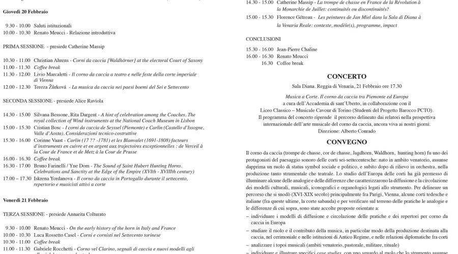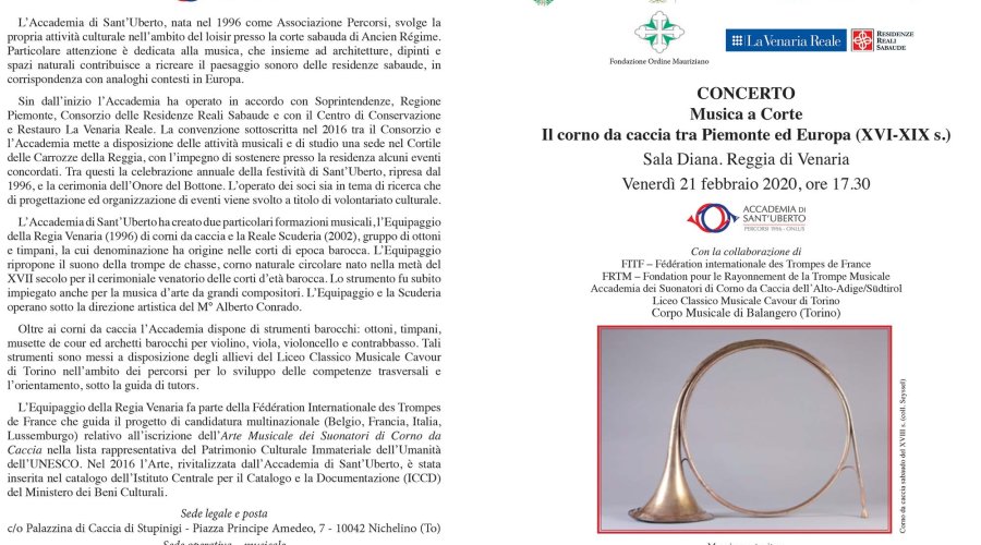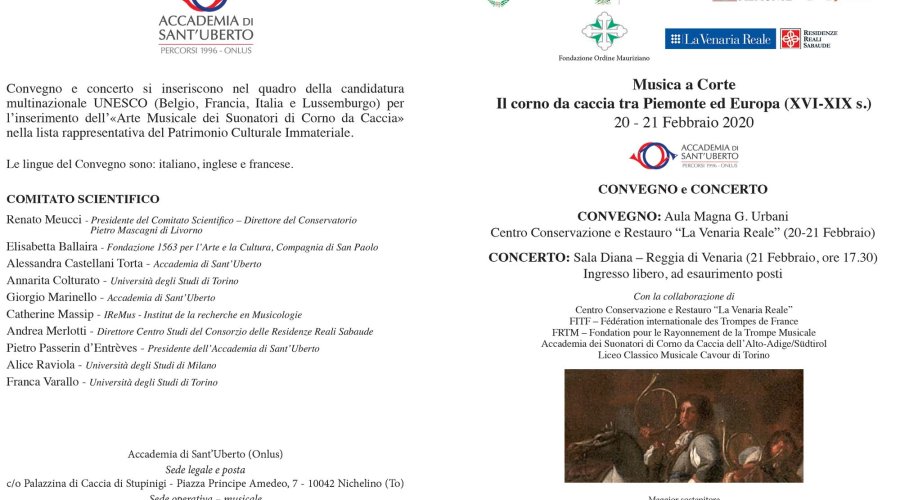 Prossimamente (20-21 febbraio) alla Reggia di Venaria si terranno, organizzati dall’Accademia di Sant’Uberto, un convegno e un concerto che avranno come protagonista il corno da caccia.