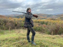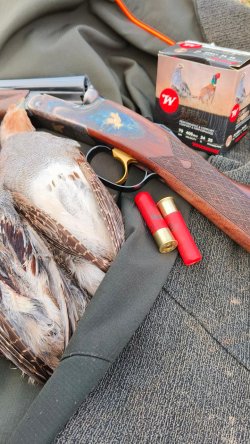 Il bracco francese di Riccardo ha un buon atteggiamento, dimostra una passione per la ricerca che lo porta ad uggiolare e letteralmente lamentarsi delle nostre pause che rappresentano per lui una ingiustificata interruzione della caccia. In una delle sue esplorazioni che avvengono in un raggio non troppo ampio ma costante e minuzioso, il cane avverte chiaramente e segnala un'emanazione che dal bosco lo porta in una breve guidata a fermare ai limiti di una strada sterrata. Faccio cenno a Riccardo di prendere velocemente posizione ma un volo di 3 starne è più rapido del mio amico e riesco con una fucilata di stoccata a prenderne una che ricade nel campo, prontamente riportata da Olmo fra le mani del suo padrone.