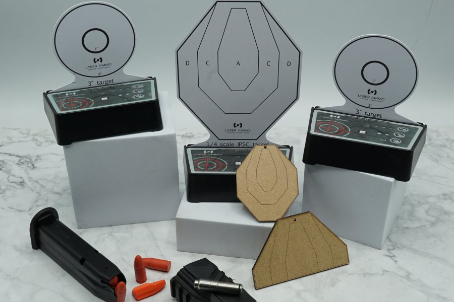 Prima di iniziare l'addestramento, verificate che l'arma sia scarica e che non vi siano munizioni vere nei caricatori da utilizzare: Perché la sicurezza viene sempre prima di tutto! Trovate un luogo adatto a casa vostra, dove possiate muovervi liberamente. Il soggiorno è spesso adatto a questo scopo. Alcuni produttori, come Laser Ammo, offrono piccoli bersagli per l'addestramento al tiro in bianco, che possono essere posizionati dovunque nella stanza che avete scelto per allenarvi. Tuttavia, se non volete spendere troppi soldi, potete anche accontentarvi di altri possibili bersagli improvvisati come prese di corrente, interruttori della luce o foglietti adesivi (tipo Post-It) posizionati a caso. Ma questa è solo una soluzione di fortuna. I bersagli speciali di Laser Ammo sono molto più utili, e in seguito vedremo perchè.