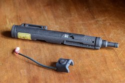 Poi, inseriamo come da istruzioni il modulo di scatto dietro il grilletto, bloccandolo in posizione con il fianchetto magnetico incluso, e colleghiamo il filo elettrico al connettore bianco posto sul corpo del WLB 15 attraverso la finestra dell'espulsore. Accanto c'è anche l'interruttore di accensione. Fatto!