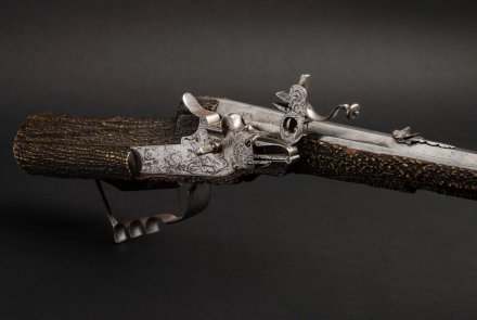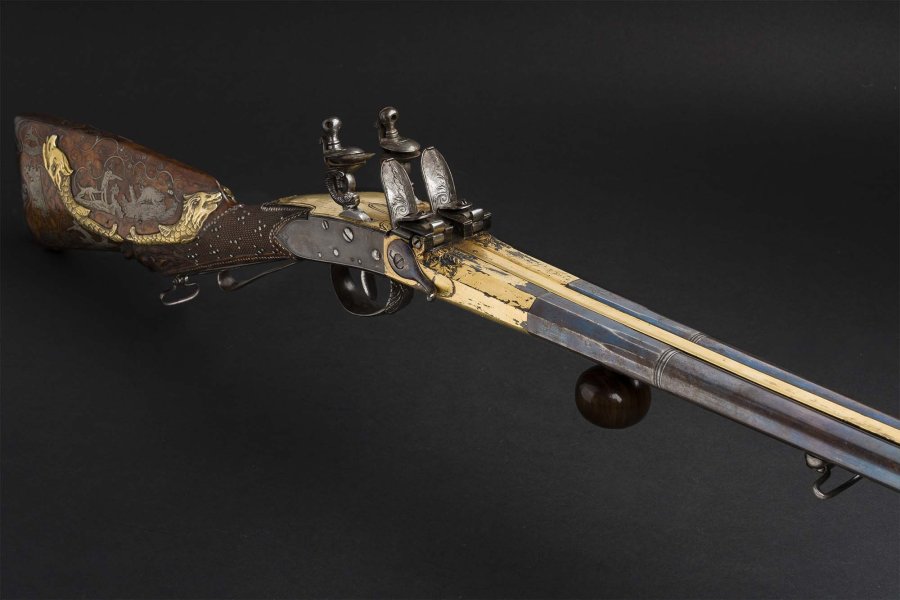 Al lotto 2060 troviamo un interessante fucile da caccia con batteria a pietra costruito in Germania meridionale, circa negli anni 1730/40. La canna rotonda è ad anima liscia in calibro 14 mm. Sulla culatta e intorno al mirino d'argento troviamo decorazioni cesellate su uno sfondo dorato, raffiguranti la dea della caccia Diana in piedi tra mascheroni e tralci di fogliame. La batteria è riccamente incisa con raffigurazioni di animali e mascheroni. Calcio completo in radica di noce con viticci finemente intagliati e rocailles. Il calcio ha una crepa vicino alla batteria e mostra piccoli difetti e riparazioni, mentre il calciolo originale è stato sostituito. I fornimenti sono in ferro cesellato di alta qualità con intarsi d'oro e motivi di caccia. La piastra laterale è traforata, con la raffigurazione di tre segugi, mentre sulla guardia del grilletto troviamo la figura di un cervo disteso. Il calciolo mostra dei segugi che combattono un cervo. La bacchetta di legno con punta di corno è stata sostituita. Lunghezza 135 cm. Il prezzo di partenza per questo fucile principesco e sapientemente restaurato è di € 11.000.