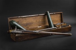 Il lotto 2072 è un lussuoso fucile a doppia canna con batterie a pietra focaia di tipo boxlock, costruito da Gauvain à Angres (Francia) datato 1800. Le canne sono a due ordini, ottagonali verso la culatta, poi rotonde, in calibro 14,5 mm con brunitura originale; la radice della canna, la volata e la bindella centrale sono rifinite con una pesante doratura a fuoco. Sulla culatta troviamo la firma finemente incisa "Gauvain Pere & Fils, Inv & Fec. - Arquebusiers à Angers, An. 1800" Il marchio del fabbricante della canna "E. Durand Tordu" è impresso sul loro lato inferiore. I cani a forma di delfino sono delicatamente cesellati. L’impugnatura del calcio è finemente zigrinata e guarnita con chiodi dalla testa a forma di diamante, mentre su entrambi i lati il poggiaguancia è decorato con applicazioni in bronzo dorato a forma di delfini. Il Calcio è decorato su entrambi i lati con raffinati intarsi e rimessi in argento che raffigurano cacciatori che sparano ad una varietà di selvaggina. Il calciolo in ferro è leggermente cesellato. La lunghezza complessiva dell’arma è di 123,5 cm. Il prezzo di partenza per questo interessante pezzo da collezione è di € 16.500