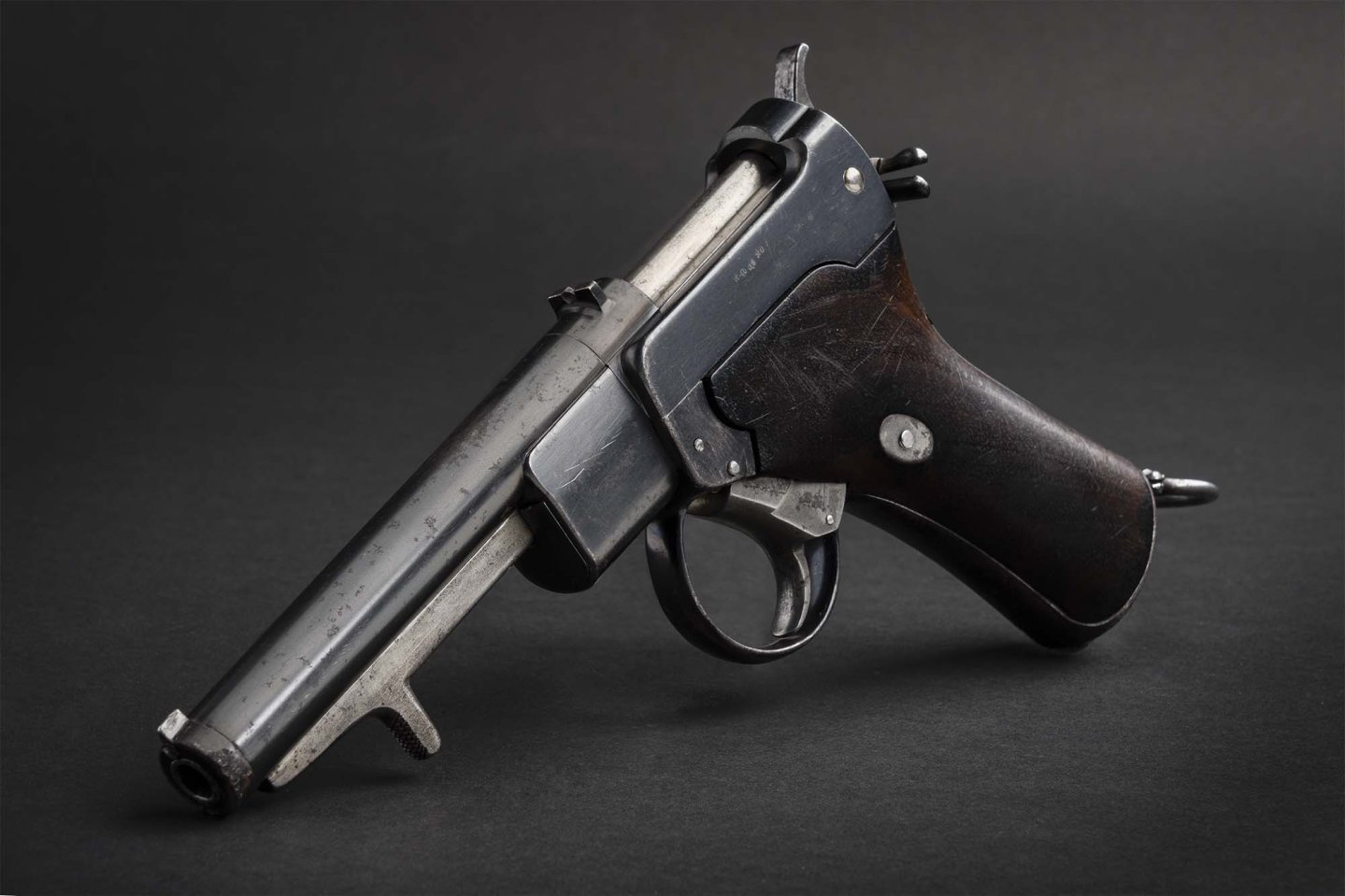 Il lotto 2291 è un’arma tipica del periodo di transizione relativamente breve, ma molto ricco per i collezionisti, che vide il passaggio dalla pistola a tamburo a quella semiautomatica attraverso i modelli a ripetizione manuale. Si tratta infatti del prototipo di una pistola a ripetizione Schulhof mod. 1887. Si tratta di uno dei tanti progetti dell’armaiolo austriaco Josef Shchulof, nato nel 1824 e titolare di diversi progetti di pistole e carabine. Esistono una manciata di prototipi e modelli destinati alla vendita delle sue pistole a ripetizione, alcune con caricatore a tamburo (come in questo caso), altri con serbatoio tubolare contenuto nell’impugnatura. Questo esemplare in particolare in calibro 8 mm Schulhof, senza numero di matricola. Il prototipo di pistola Schulhof monta una canna ottagonale con sei rigature, lunga 155 mm sulla quale è montato a coda di rondine un mirino a lama. Anche la tacca di mira è montata a coda di rondine sul fusto. La pistola, che è a ripetizione (non semiautomatica) impiega un caricatore ruotante dalla capacità di sei colpi. La ripetizione del colpo avveniva portando in avanti re quindi indietro la leva di armamento con l’anello. Il lato sinistro della carcassa è marcato "Bréveté". La leva di sicurezza e quella di armamento sono zigrinate e tutte le parti metalliche sono nichelate. Su questo esemplare sono presenti alcune macchie in corrispondenza della canna, piccoli segni di manipolazione sulla carcassa e sull'impugnatura. Le mire, l'anello della leva e il grilletto mostrano tracce di brunitura a fuoco. L’impugnatura è in legno di noce zigrinato. Questa pistola è illustrata e descritta nel volume di Mötz/Schuy, "VomUrsprung der Selbstladepistole" (L’origine delle pistole semiautomatiche) nelle pagine 66-68. Il prezzo di partenza di questo pezzo molto interessante è di € 13.000.
