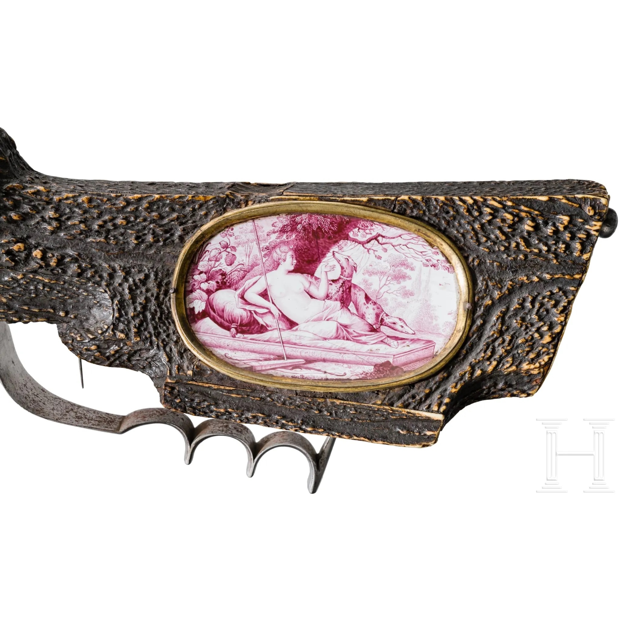 Al lotto 2060 troviamo un interessante fucile da caccia con batteria a pietra costruito in Germania meridionale, circa negli anni 1730/40. La canna rotonda è ad anima liscia in calibro 14 mm. Sulla culatta e intorno al mirino d'argento troviamo decorazioni cesellate su uno sfondo dorato, raffiguranti la dea della caccia Diana in piedi tra mascheroni e tralci di fogliame. La batteria è riccamente incisa con raffigurazioni di animali e mascheroni. Calcio completo in radica di noce con viticci finemente intagliati e rocailles. Il calcio ha una crepa vicino alla batteria e mostra piccoli difetti e riparazioni, mentre il calciolo originale è stato sostituito. I fornimenti sono in ferro cesellato di alta qualità con intarsi d'oro e motivi di caccia. La piastra laterale è traforata, con la raffigurazione di tre segugi, mentre sulla guardia del grilletto troviamo la figura di un cervo disteso. Il calciolo mostra dei segugi che combattono un cervo. La bacchetta di legno con punta di corno è stata sostituita. Lunghezza 135 cm. Il prezzo di partenza per questo fucile principesco e sapientemente restaurato è di € 11.000.
