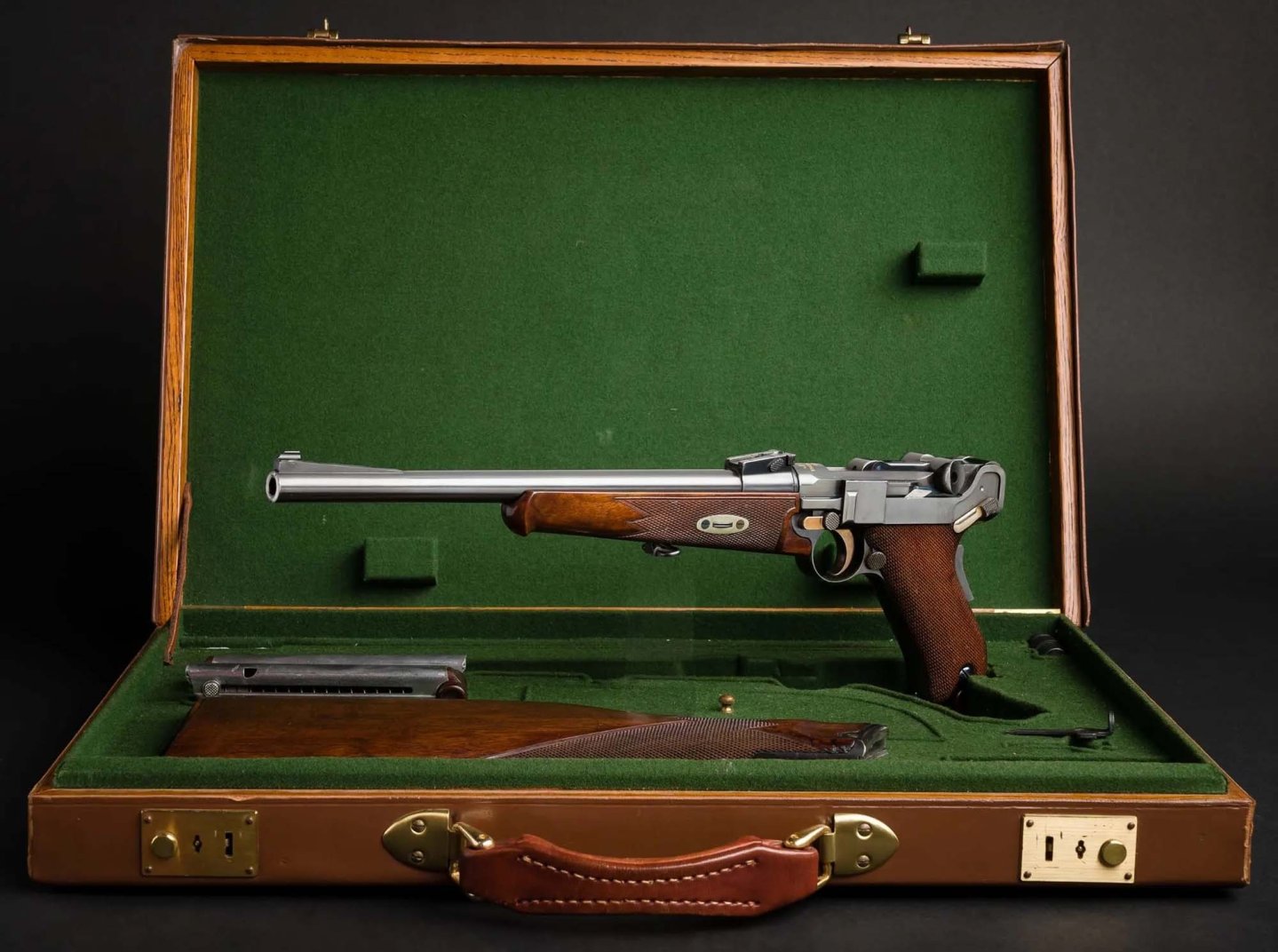 Uno dei pezzi forti della collezione è la versione "Cartridge Counter" di una American Eagle Parabellum DWM Mod. 1902 in calibro 9 mm Luger del 1908. La pistola riporta su tutte le parti il numero di matricola 22408 mentre il percussore e la sicura sono privi di numero di serie. La pistola presenta una canna pesante (fat barrel, nel gergo dei collezionisti di Luger) lunga 100 mm. Questa versione della Luger ha una tacca di mira a V ed è dotata di un estrattore piatto originale con finitura color paglia e sicura automatica sull'impugnatura. In corrispondenza della camera di cartuccia presenta il punzone dell’aquila americana e la parte anteriore del ginocchiello reca il logo DWM. Quasi certamente la brunitura è quella originale. Tutti i comandi manuali hanno una finitura di tonalità paglierina, mentre le minuterie sono state brunite. Anche le guancette in noce, che presentano una fine zigrinatura, recano numeri di serie corrispondenti. Sul lato sinistro dell’impugnatura possiamo vedere la lunga finestra del "contatore di cartucce", numerata da 1 a 7 che permetteva all’utilizzatore di verificare la quantità di colpi presenti nel caricatore. Il caricatore nichelato con base in legno non è matricolato. La prima offerta per questa vera rarità parte da 35.000 euro.