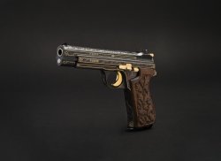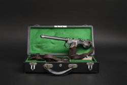 Anche la croce svizzera è stata rimessa in oro, mentre i comandi e il cane sono placcati in oro zecchino. Le guancette dell’impugnatura in legno di noce scuro contrastano con le incisioni longitudinali, anch'esse in oro, che delimitano i piani rettilinei del fusto e del carrello. La pistola è camerata in calibro 9 mm Luger. Il numero di serie è P 80040, e tutte le parti matricolate riportano la stessa cifra, compresa la scatola originale. L’arma è in condizioni nuove e con una canna rifinita a specchio. La SIG Sauer P 210-L De Luxe viene anche fornito con un certificato di autenticità. Il prezzo di partenza è di 3.000 euro.